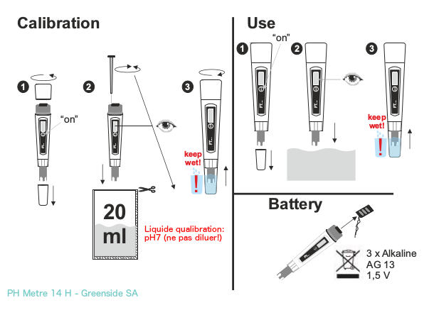 - Voordat een meting wordt uitgevoerd, moet de pH-indicator worden gekalibreerd. Hiervoor worden bufferoplossingen gebruikt. Als je pH-indicator slechts op één punt kan worden gekalibreerd, moet je de bufferoplossing gebruiken die het dichtst bij je normale metingen ligt (voor PH7 drinkwater).